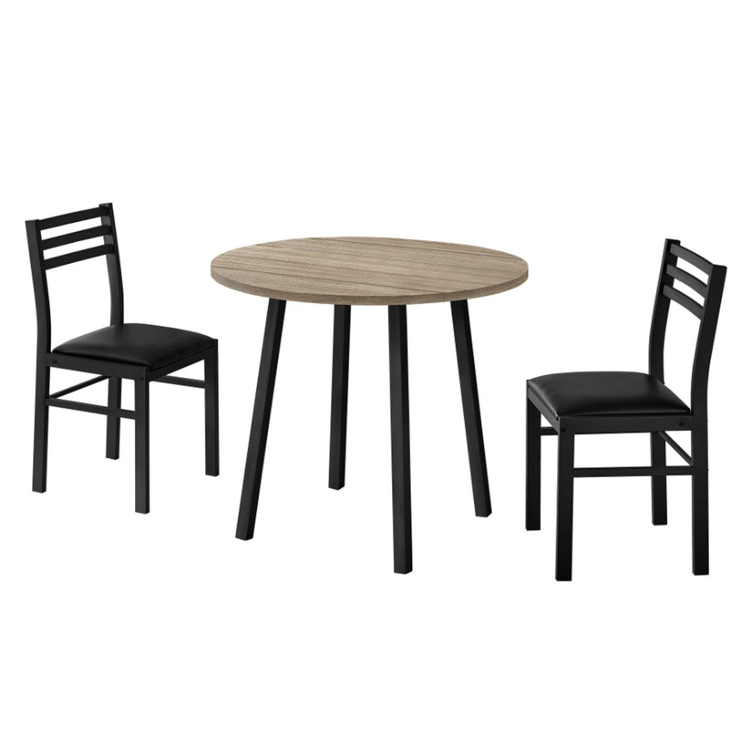 | Feature 1 | 3-piece dining table set includes a round table with hinged drop leaves and 2 chairs with padded, upholstered seats in a black leather-look fabric |