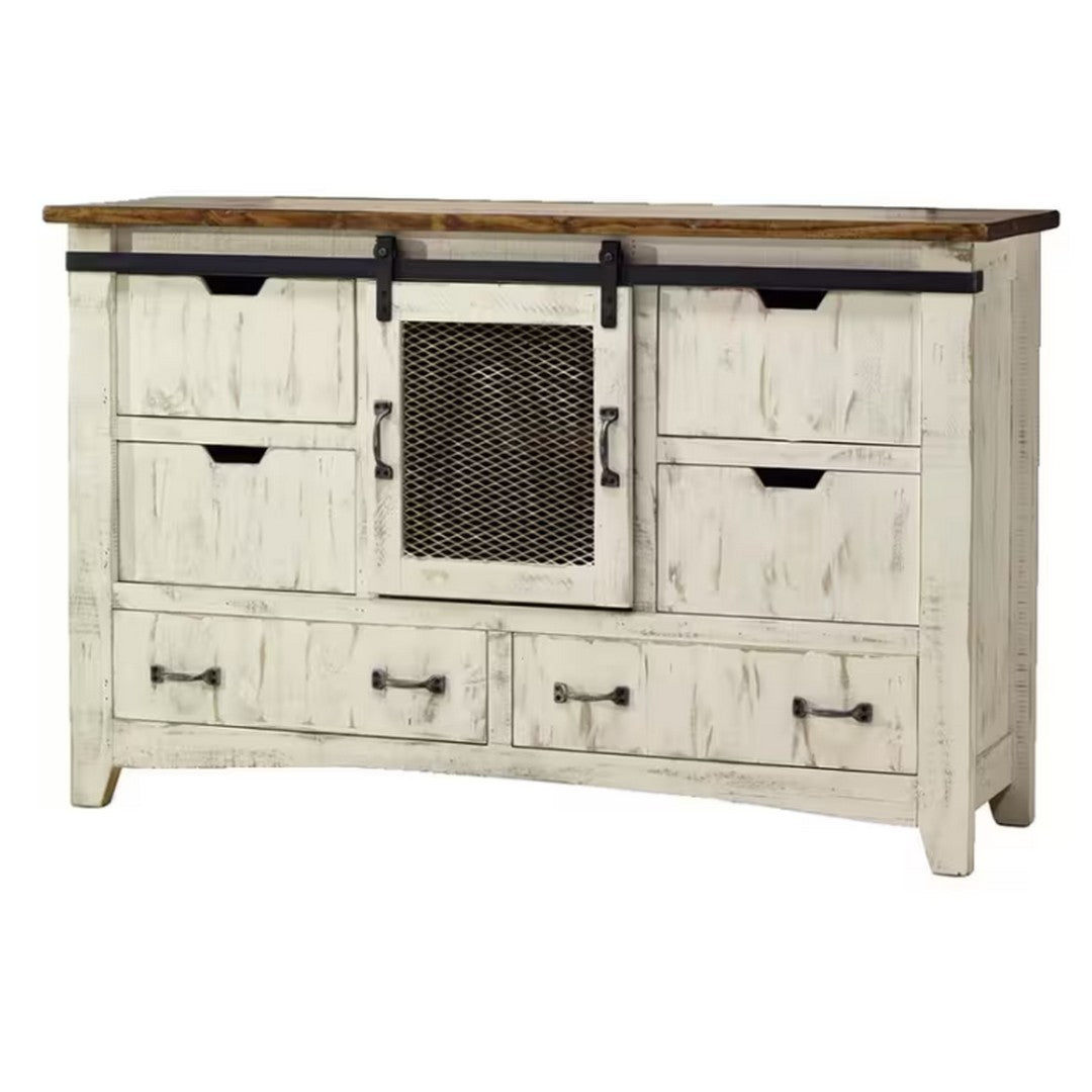 Just imagine this large dresser, fashioned in a shabby chic distressed whitewash finish, in your bedroom either at home, or at the cottage or beach house. With its barn door style sliding door, it is a beautiful statement piece that has just as much function as it has form.