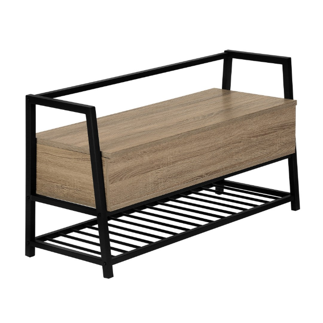 Keep your entryway or hallway clutter free with this versatile storage bench. The hinged top lifts to reveal a spacious interior storage cabinet. Under the bench is a shelf for neatly organizing shoes or other items. Conveniently sized and big in functionality, this storage bench in a dark taupe wood-look finish with a black metal frame is brimming with style and substance.