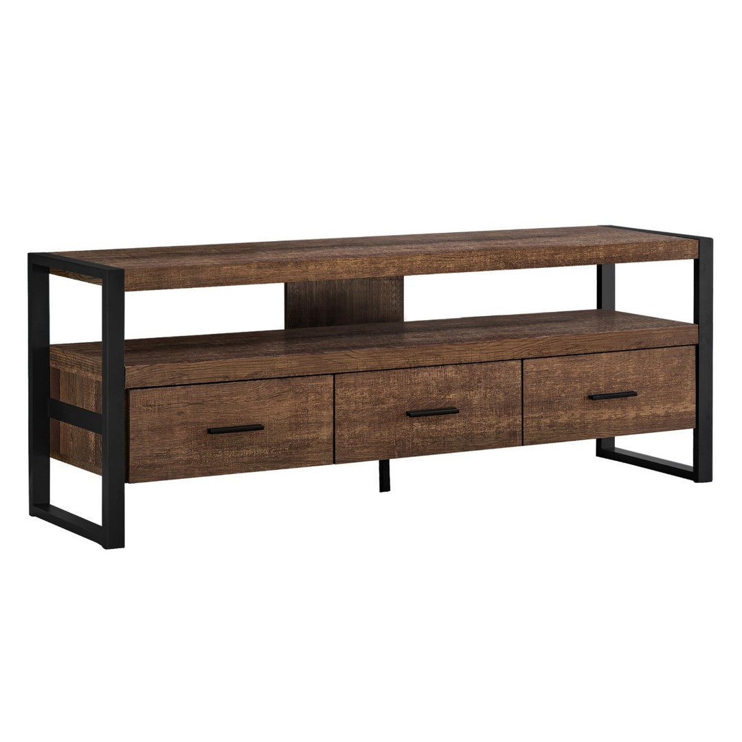 Bring an industrial-inspired style to your entertainment space with this low-profile open back TV stand. The bold design starts with strong black satin metal supports at each end and in the center, and with thick paneled 60-inch-long shelving that can hold any size TV once centered. Finished in a warm brown reclaimed wood-look, this TV stand features a long open shelf to place your audio/visual equipment or a sound bar. The three closed drawers on smooth metal glides, are accented with sleek black handles, roomy enough to store all your accessories, keeping everything organized in one place but out of sight. Assembly is required.