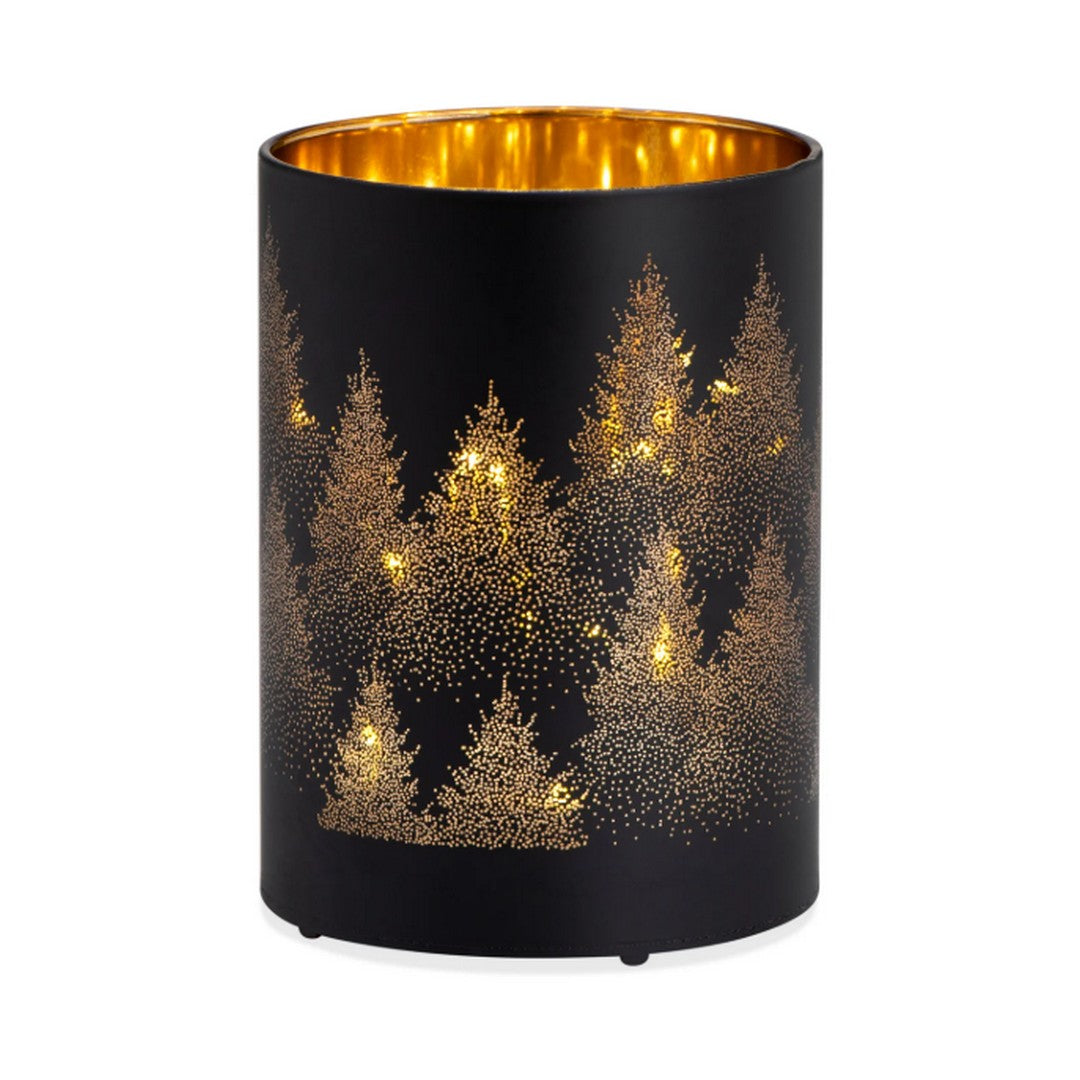 Give your space a cozy and inviting feel with this LED hurricane lamp. Micro LED lights shine from within and reflect the gold tone through the silhouette tree design shape on the outside of the black glass lamp. Place on a shelf or table to instantly make your space shine.