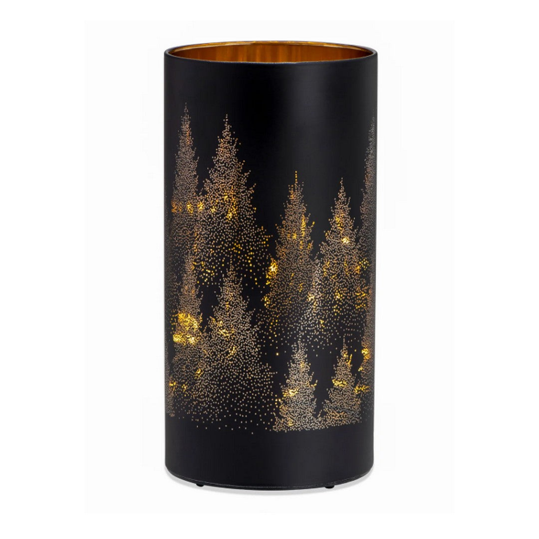 Give your space a cozy and inviting feel with this LED hurricane lamp. Micro LED lights shine from within and reflect the gold tone through the silhouette tree design shape on the outside of the black glass lamp. Place on a shelf or table to instantly make your space shine.