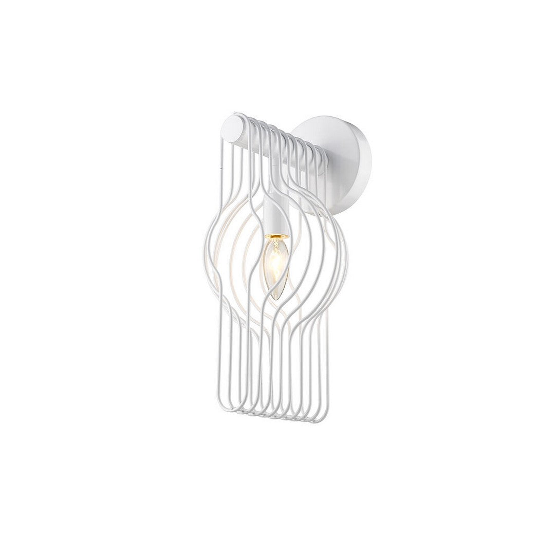 Doubling down on ultra-modern style, this single-light wall sconce becomes a focal point in a compact contemporary bathroom, bedroom, or hallway. Careful detailing yields a linear design of white finish steel rods and a glossy white finish frame. A charming candelabra bulb mount delivers a softening effect with pure style. Store display, undamaged but used.